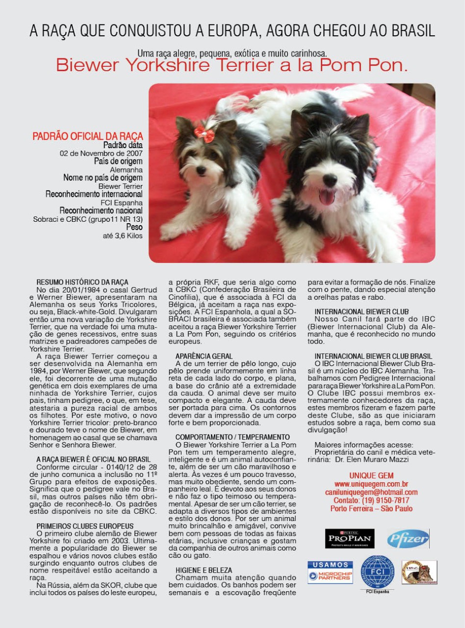 Os lindíssimos biewers Gaby e Joy nascidos no canil Dallexx Dreams e que foram para a família da nossa amiga e veterinária Elen Muraro, proprietária do canil Unique Gem (clique aqui para entrar no site do canil), foram fotos de uma reportagem sobre a raça Biewer na revista da Feira Pet de Ribeirão Preto em 2013.